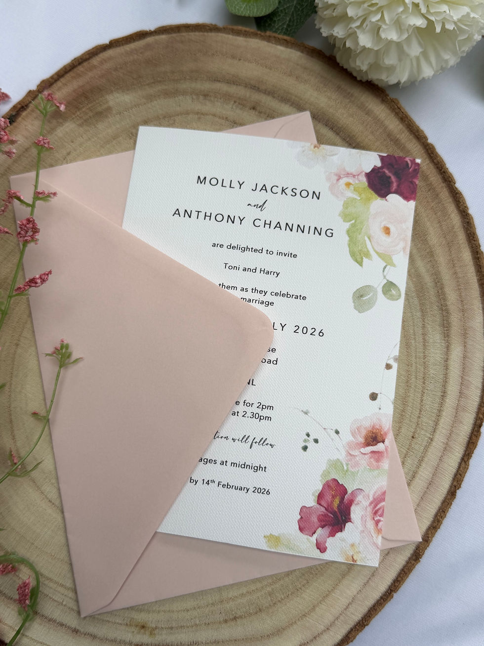 Bouquet embossed arch shaped wedding invitation with guest info card